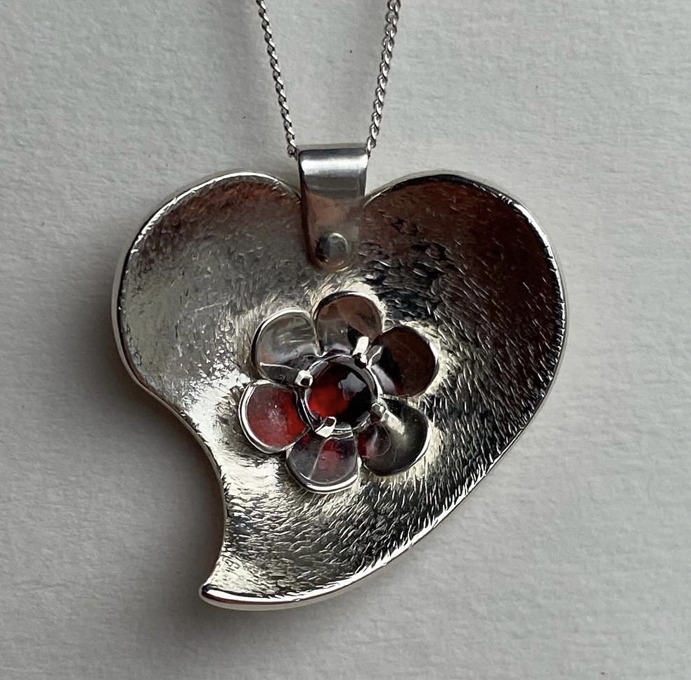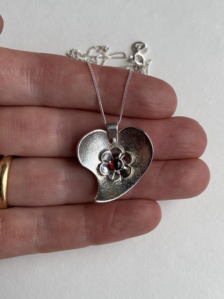 Heart pendant, handmade from textured sterling silver with a 4mm garnet gemstone set within the heart in a silver flower. 24 x 24mm.