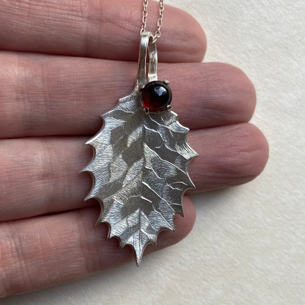 Holly leaf pendant. Handmade and engraved from 1 mm sterling silver with a 6mm round cabochon garnet berry. 46 x 24 mm. Hallmarked by the Sheffield Assay Office.