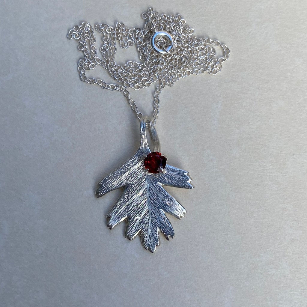 Hawthorn leaf and berry pendant. Handmade and engraved from argentium silver, with a 5mm garnet berry. Hallmarked by the Sheffield Assay Office.