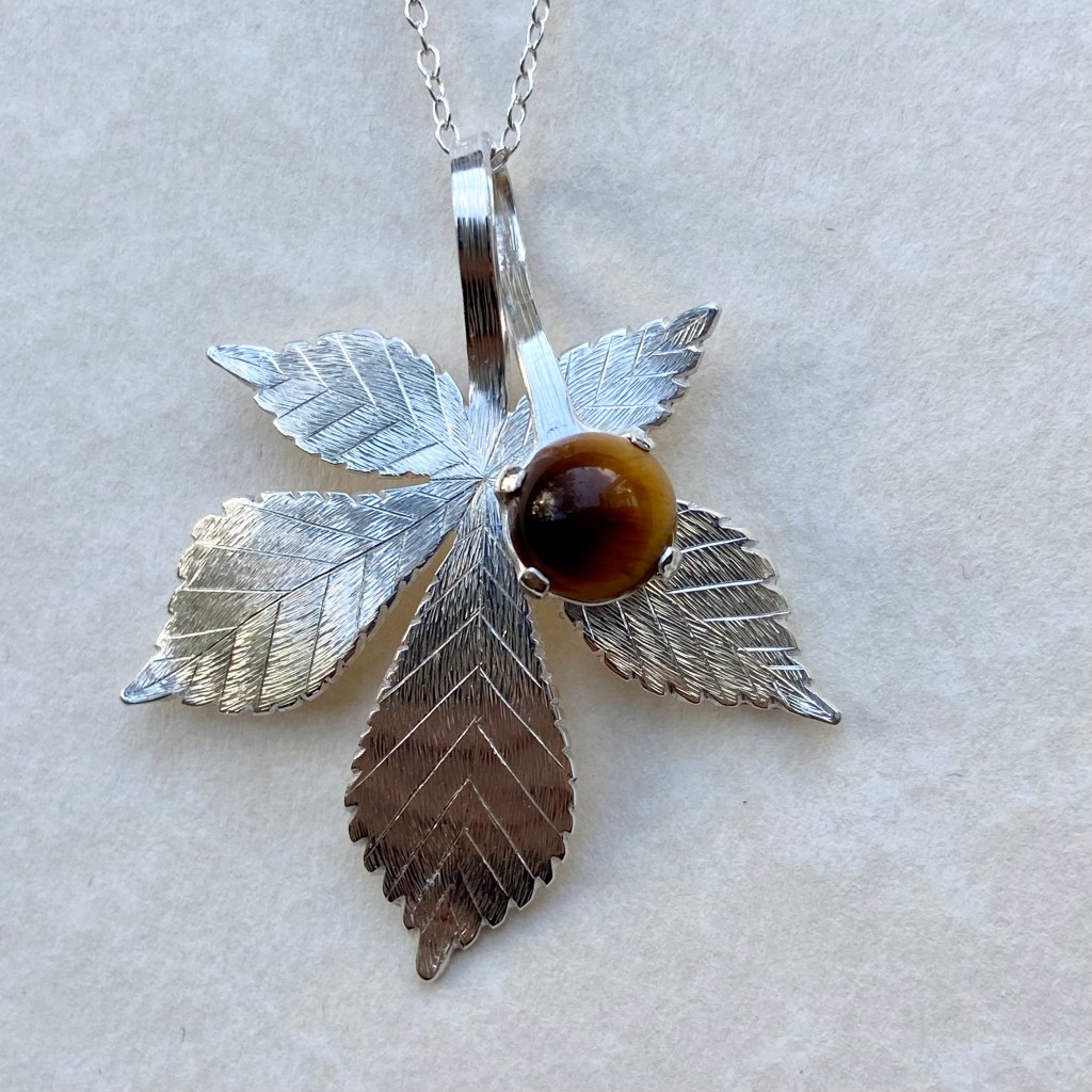 Horse chestnut leaf pendant, handmade and engraved from hallmarked sterling silver with an 8mm tiger’s eye gemstone chestnut. 43 x 37 mm. Hallmarked by the Sheffield Assay Office.